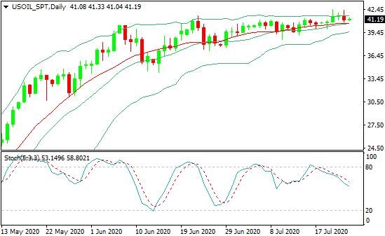 1小时图:保利加通道下滑,油价在中轨下方发展;14和20小时均线看跌;随机指标走低。