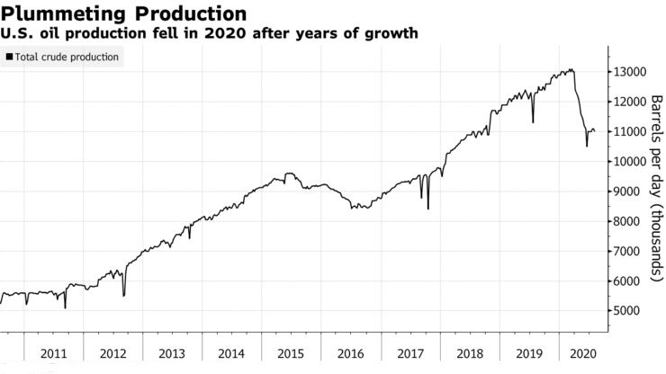 如下图所示,在经历几年的增长后,美国总的石油产量出现减少