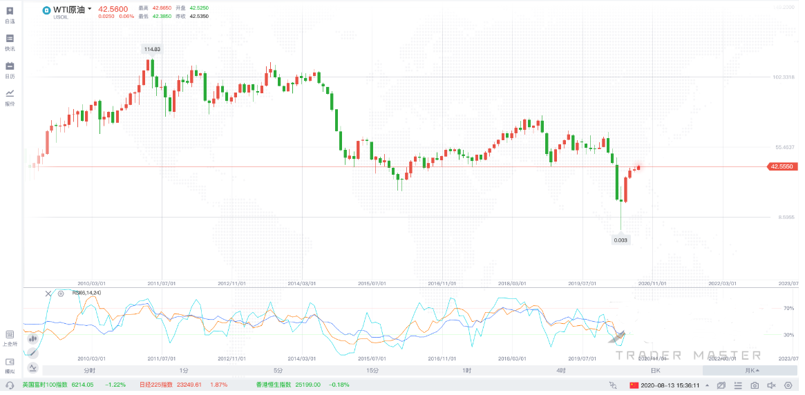 从WTI原油的月线图中可以看出,原油价格在过去4个月一直在上涨,但相对强弱指标(RSI)仍处于50%中性区域下方,这说明了原油还有上涨的空间。