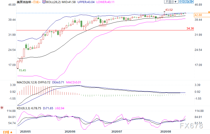 日线级别:窄幅震荡;布林带始终趋平,油价徘徊上轨附近,但始终难以有效上破;目前MACD粘合、动能及其微弱,KDJ初步金叉、指数接近70。技术面看,油价整体动能微弱,料等待方向性突破。