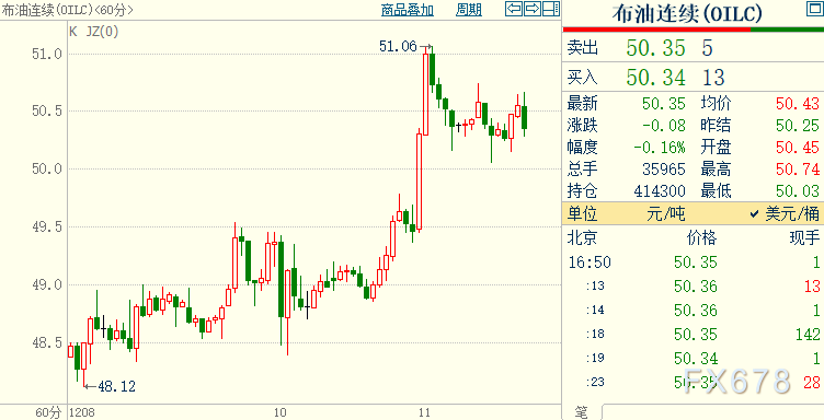 北京时间16:49,NYMEX原油期货上涨0.32%至46.93美元/桶;ICE布伦特原油期货上浮0.30%至50.40美元/桶。两市上日分别大涨3.19%和2.96%,布油自3月份以来首次上破50美元/桶。