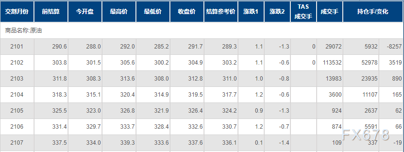 上海原油价格小幅上涨,主力合约2101终盘收于291.7元/桶,涨1.1元/桶,涨幅0.38%。