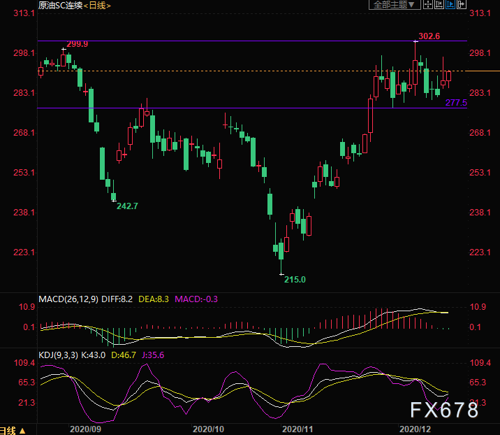 交易逻辑:美原油整体上涨趋势未变,短期震荡上行,基本面向好,疫苗继续提振市场的风险偏好。INE原油继续通道震荡,上方压力302,下方支撑277。