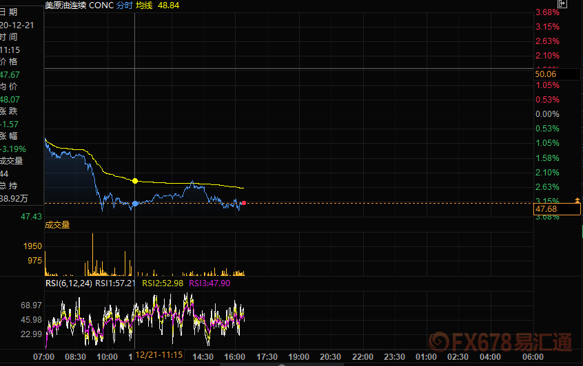 周一(12月21日)亚洲时段,美原油低开低走,一度下跌逾3%至47.43美元/桶,上周末英国出现变种病毒株,英国伦敦紧急“封城”,欧洲多个国家,阻止来自英国的航班入境,增加了市场对原油需求前景的担忧;此外,美国新冠疫苗出现多起不良反应,美国原油钻井数据增加,都令油价承压。