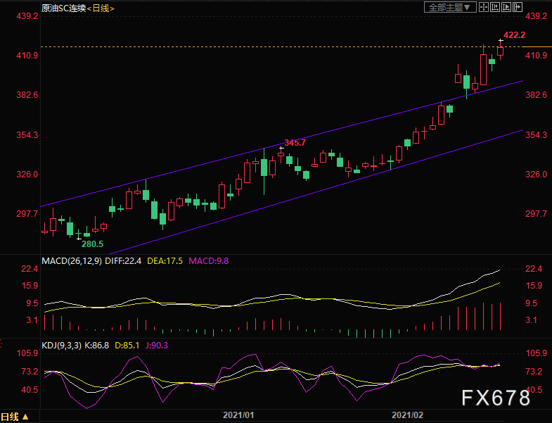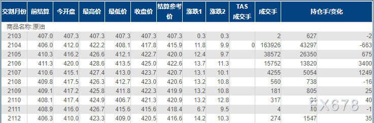 上海原油价格大幅上涨,主力合约2104终盘收于417.8元/桶,涨11.8元/桶,涨幅2.91%。