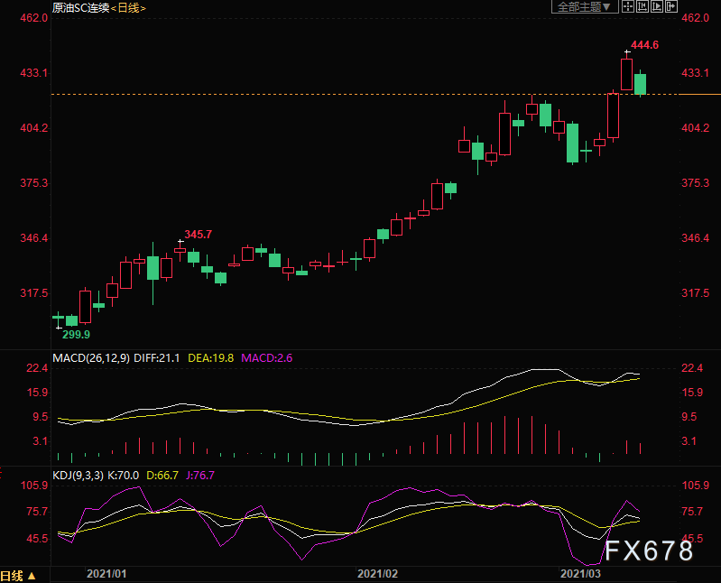 上海原油价格大跌,主力合约2104终盘收于422.7元/桶,跌10.9元/桶,跌幅2.51%。