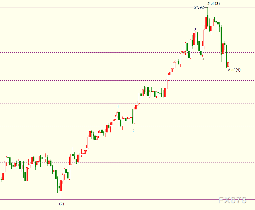 日线图上看,A浪和B浪都是自67.98美元开启的回调(4)浪的子浪。(4)浪料进一步跌向54.88美元,它是自33.64美元开启的上行(3)浪的38.2%斐波那契回档位。