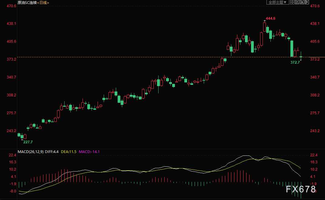 上海原油价格大跌,主力合约2105终盘收于378.1元/桶,跌14.1元/桶,跌幅3.6%。