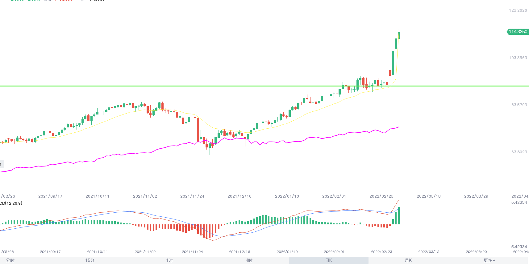三月刚刚过去两天,国际油价就在不停的刷新高度。3月1日WTI原油价格大涨11.09%,收盘站上106.34美元,布伦特原油价格大涨9.88%,收盘站上107.65美元。3月2日国际油价延续涨势,WTI原油收涨4.7%,报112.83 美元,近十年来首次收盘站上110美元,布伦特原油收涨6.75%,报117.32美元/桶,自2008年以来首次站上115美元关口。在撰写本文时WTI原油突破115美元/桶,日内涨日内涨3.98% ,创2008年以来新高,布伦特原油日内大涨3.00%,最高触及118.18美元。