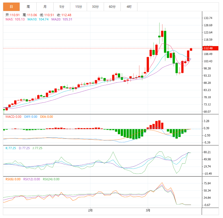 周二亚盘,美油延续涨势,刷新一周半高点至112.54美元/桶;油价周一连续第三天上涨,美油上涨超7.0%,因部分欧盟国家推动对俄罗斯实施第五轮制裁,且俄罗斯入侵乌克兰的战争已经爆发近一个月,却仍未有结束迹象,加剧了有关市场失去俄罗斯原油供应的担忧。
