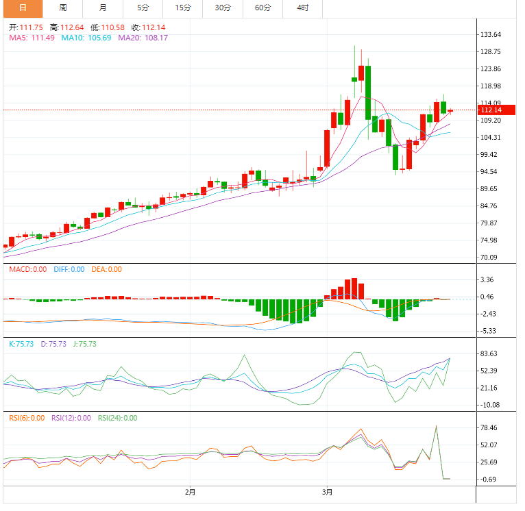 原油从技术面来看,日线级别来看震荡上涨;KDJ金叉,MACD也初步金叉均线初步多头排列,后市偏向多头,目前正试探130.5-93.5跌势的61.8%回撤位116.36附近阻力,如果顶破该阻力,则油价将打开更大的上涨空间,有较大概率会重新涨向120关口上方,甚至重新试探前期高点130关口附近阻力。不过,在有效突破116.36阻力前,也需要提防油价震荡回调的风险,初步支撑在5日均线110.24附近,失守该位置前,后市偏向多头,21日均线支撑在106.60附近,如果失守该支撑,则削弱看涨信号,并增加短线下行风险。