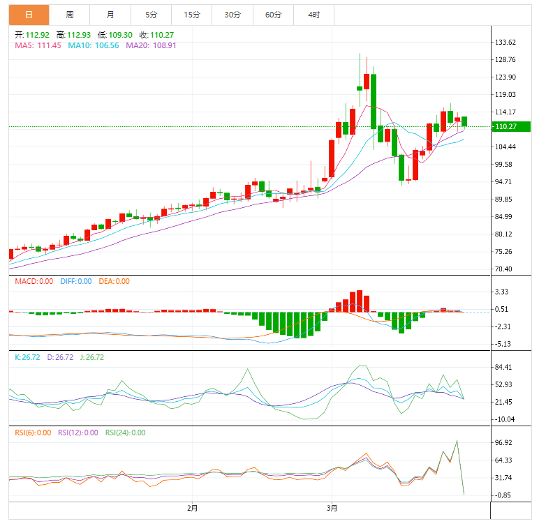 周一亚盘,美原油低开低走,目前下跌逾3%,交投于110.29美元/桶附近,因全球疫情蔓延担忧;油价上周上涨超9%,为三周以来首次录得单周上涨,因也门的胡塞武装声称对沙特阿美石油设施受到的一系列袭击负责,其中包括在吉达的一处储油设施,俄罗斯与乌克兰的冲突继续搅乱本已紧张的大宗商品市场。