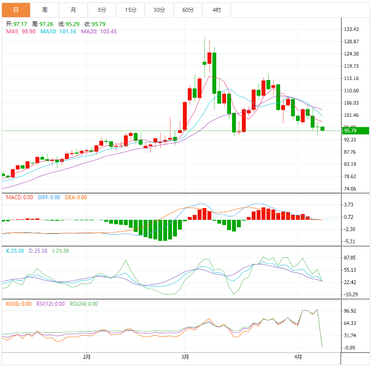 技术面来看,日线级别来看震荡;MACD死叉,KDJ死叉,21日均线依然*油价,目前初步失守55日均线支撑,短线偏向继续试探3月15日低点93.53附近支撑;进一步支撑参考2月25日低点90.06附近,强支撑参考100日均线,目前在87.89附近,接近2月18日低点。如果93.53下破未果,并向上顶破21日均线104.22附近阻力,则增加短线看涨信号。进一步阻力参考3月30日高点108.75附近。短线的话,在顶破5日均线99.80前(或参考100关口附近阻力),后市略微偏向空头。油价的整体k线的收缩震荡有向下突破的势头,不过油价短期下行空间似乎也比较有限,因为当前价格仍然运行在长期均线上方。