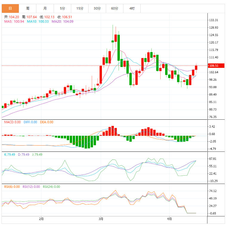 周五亚盘,原油徘徊于106.54附近,本周WTI原油价格上涨8.8%,而布伦特原油上涨8.7%。周五大多数金融市场因耶稣受难日休市,包括纽约商品交易所(NYMEX)与欧洲洲际交易所期货(ICE Futures Europe)的能源交易。与此同时,美国天然气期货最终创2008年10月以来的最高收盘价。分析师将近期上涨归因于与天气相关的需求上升、供应紧绷,以及煤炭价格上涨,煤炭与天然气相互竞争为能源来源。上周天然气供应量意外增加的报告公布后,天然气价格仍持续走涨。
