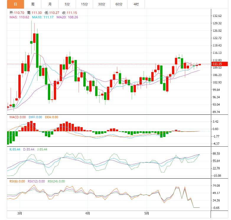 随机指数正在上升,但接近超买区域,反映出买家的疲态。这可能意味着抛售压力正在回升,也支撑了油价将跌破低点的观点。进一步看,5月17日高点附近的类似“黄昏之星”K线组合的利空影响仍在,在顶破5月19日高点112.62前,后市略微偏向震荡下行,初步支撑在5月20日低点108.13附近,布林线中轨支撑在106.86附近,若失守该支撑,则增加短线看空信号。