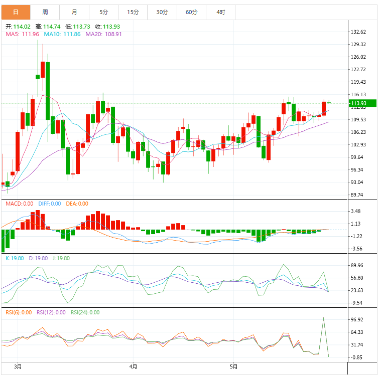 技术面,5月17日高点附近的类似“黄昏之星”K线组合的利空影响仍在,在顶破5月19日高点112.62前,后市略微偏向震荡下行,初步支撑在5月20日低点108.13附近,布林线中轨支撑在106.86附近,若失守该支撑,则增加短线看空信号。另外55日均线支撑目前在105.16附近,5月19日低点支撑也在该位置附近,需要予以关注。