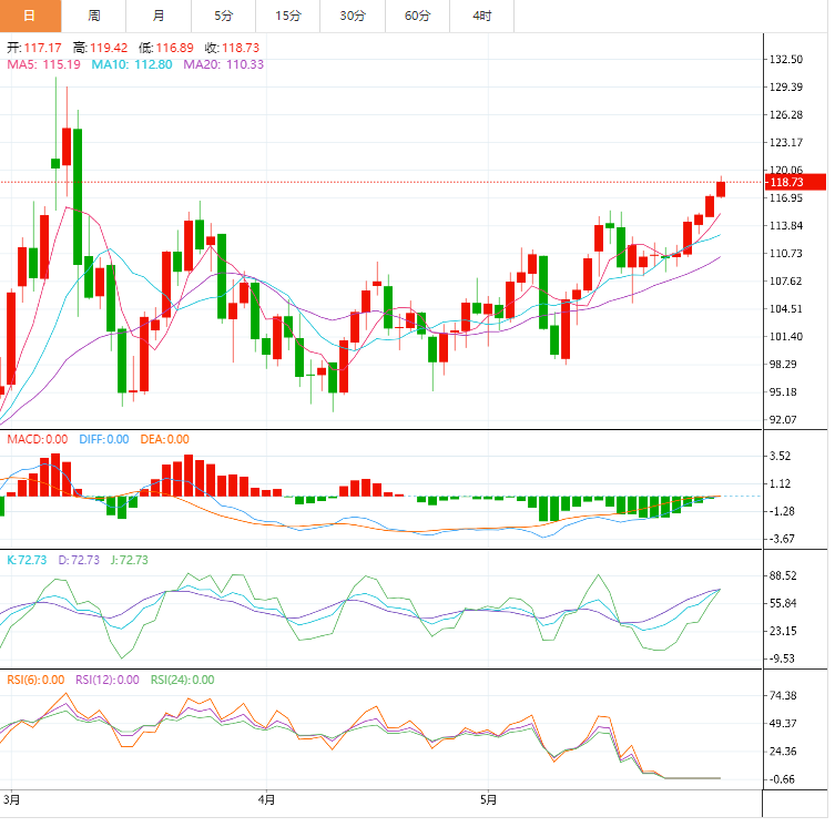 油价全面上涨至每桶123美元左右,接近历史最高水平。100的SMA值高于200的SMA值,表明阻力最小的路径是向上的。