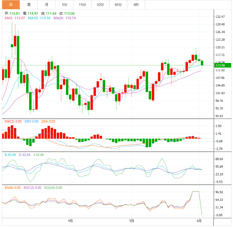 原油卖主充满希望的还有前一天跌破5月初的上行支撑线,目前阻力位在114.10美元附近。