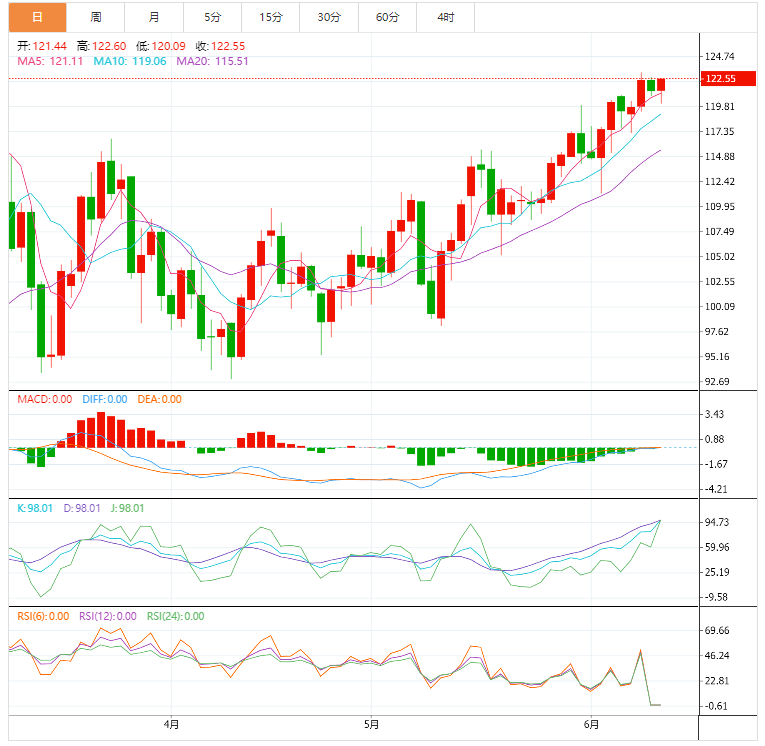 相对强弱指数也在超买区域附近徘徊,但振荡器似乎正在触顶并逐渐转向较低。突破每桶120美元的水平可能足以确认下行趋势。