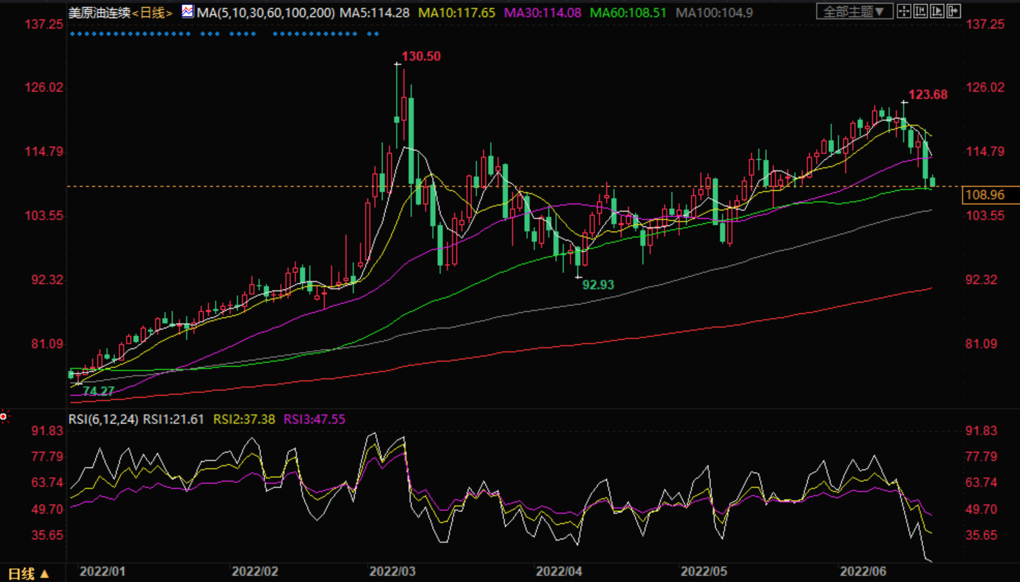 然而,原油交易低于这两个移动平均线,这是熊市压力的早期迹象。如果跌破每桶110美元的支撑位,可能标志着这种大宗商品涨势开始逆转。