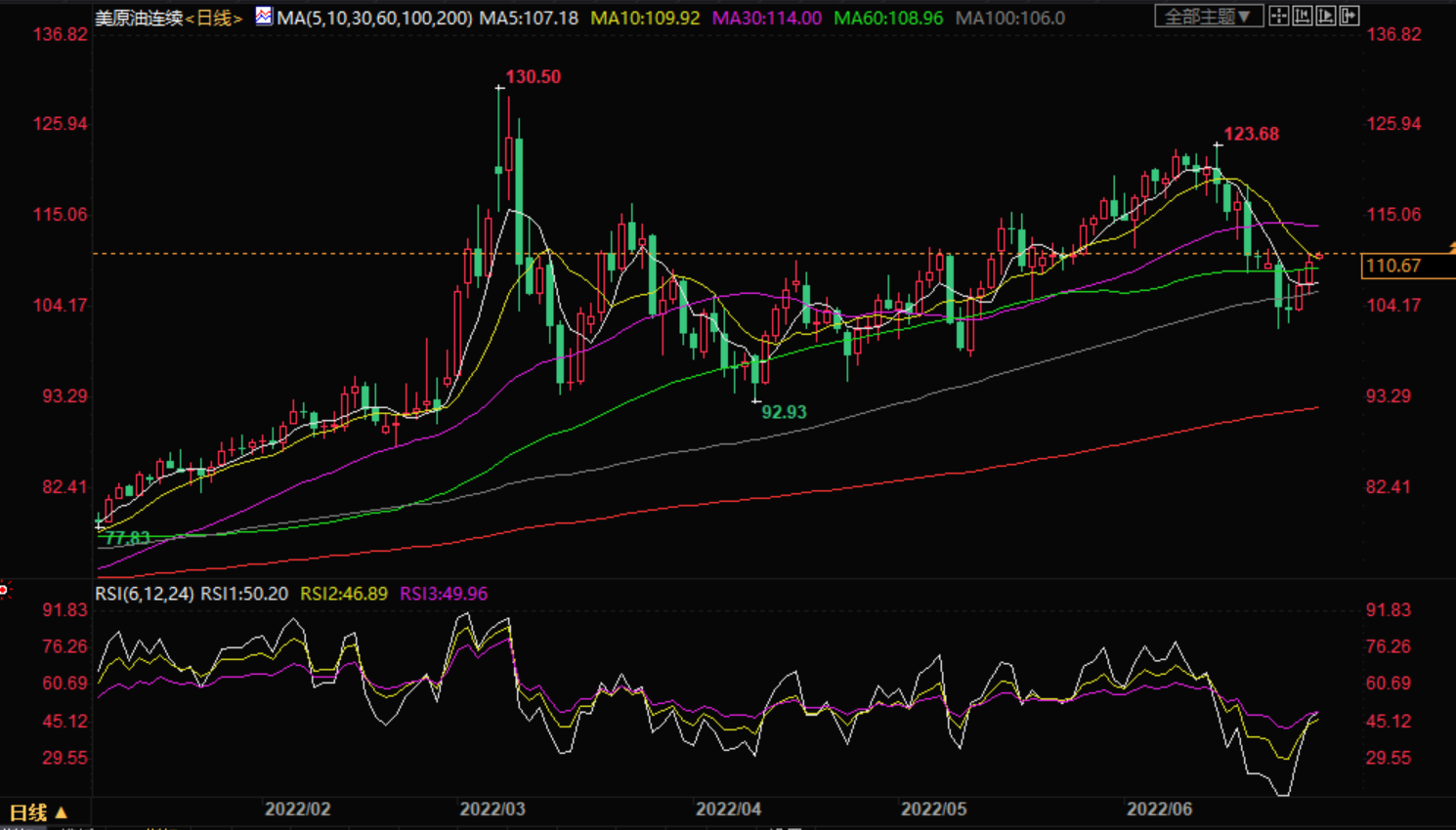 周二亚盘,美原油拉升,徘徊于110.74附近。油价周一上涨近2美元,受助于供应更加紧张的前景,此前七国集团(G7)承诺进一步切断俄罗斯总统普京战争资金的来源,同时推动能源价格回落。消息人士称,OPEC及其包括俄罗斯在内的盟友组成的OPEC+在周四开会时可能会坚持8月加速增产的计划。路透看到的一份报告显示,OPEC+将其预计的2022年石油市场供应过剩量从之前的140万桶/日下调至100万桶/日。