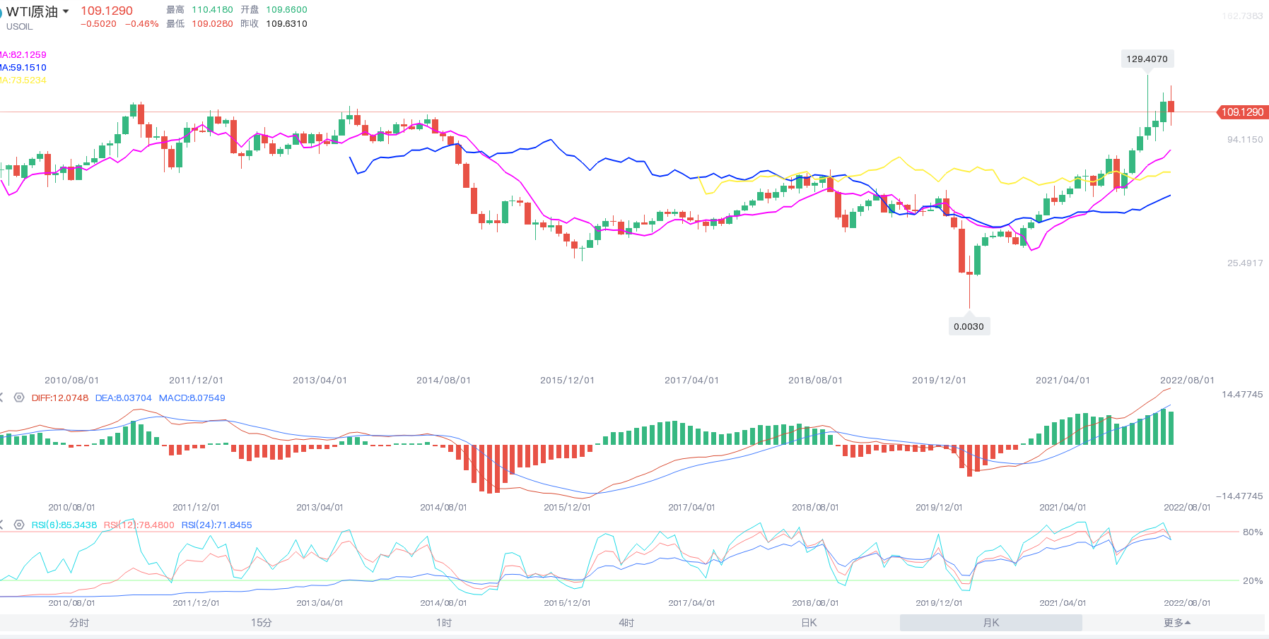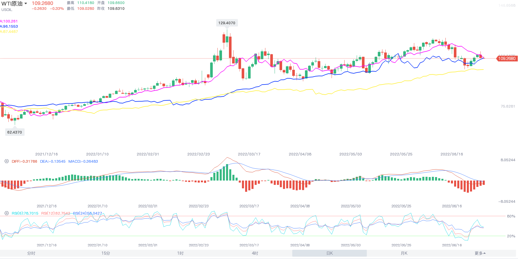 6月原油开盘115.43,最高123.63,最低101.52,截至发稿,油价徘徊在109.95附近