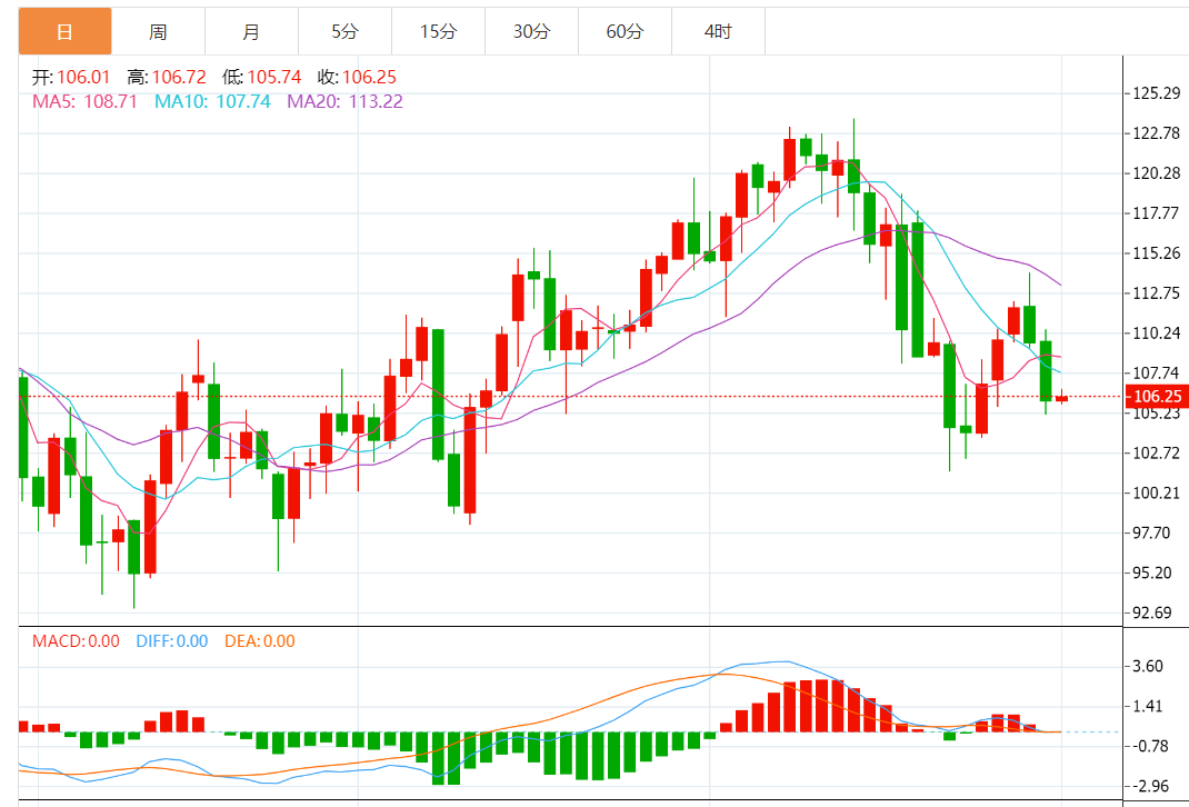 由于MACD 信号看跌且相对强弱指标未进入超卖,同时汇价处在21 日均线下方,空头将占据主导。也就是说,WTI油价需要明确跌破103.70 美元的支撑汇合处,才能延续下跌指向月线低位101.70 美元附近。