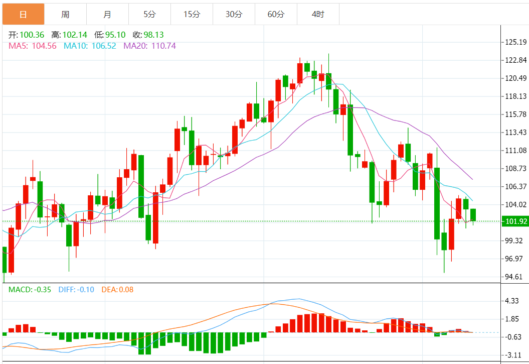 技术上,目前KDJ向下发散,MACD红色柱萎缩且有死叉趋势,短线下行风险有所增加,目前正试探布林线中轨,短线偏向进一步跌向布林线下轨97.13附近;当然,短线的话,100整数关口附近也还存在一些支撑。