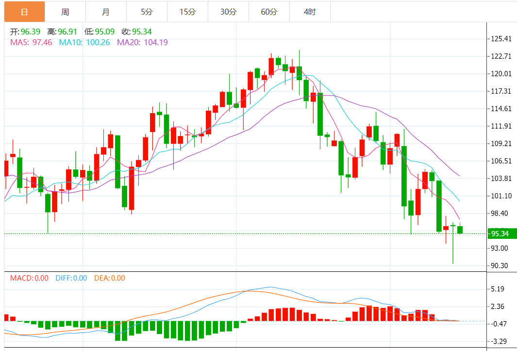 技术上,K线录得长下影线十字星,在收盘于200日均线下方前,油价短线震荡筑底的机会有所增加,上方初步阻力在5日均线97.55附近,10日均线阻力在100.33附近,若能收复该位置,则削弱后市看空信号;进一步阻力在7月12日高点103.35附近(接近下行趋势线),21日均线阻力在104.51附近。