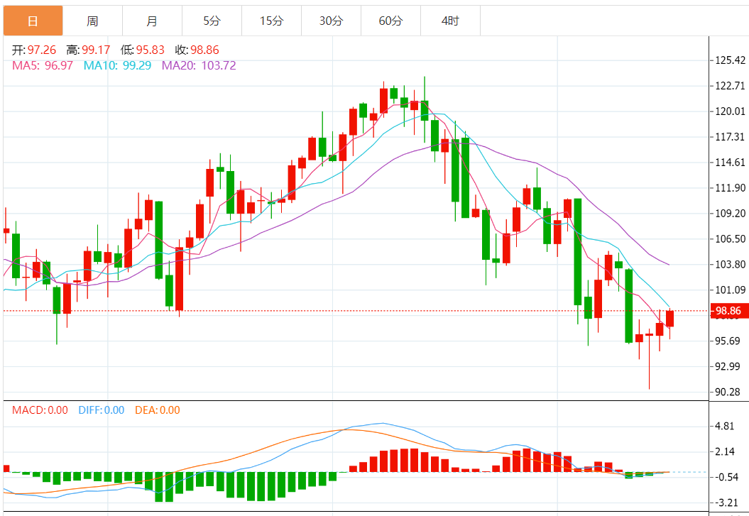 技术上,油价目前正试探10日均线99.29附近阻力,进一步阻力在100整数关口附近,若能收复该位置,则增加短线看涨信号;之前下行趋势线阻力在101.50附近,21日均线阻力在104.03附近。
