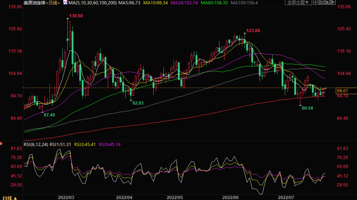 周四亚盘,美油交投于98美元/桶附近,油价周三大涨近3%,因美国库存减少和俄罗斯输往欧洲的天然气减少,抵消了对需求疲软和美国加息的担忧。美国大涨也给油价提供了一些上涨动能。