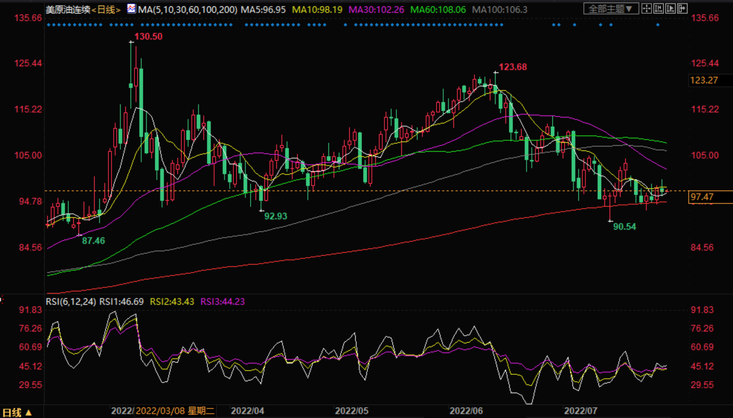 周五亚盘,美油现报97.49美元/桶;油价周四下跌近1%,因对全球可能陷入衰退将打击能源需求的担忧,抵消了美国原油库存下降和汽油消费反弹的影响,但地缘局势紧张依然支撑油价。