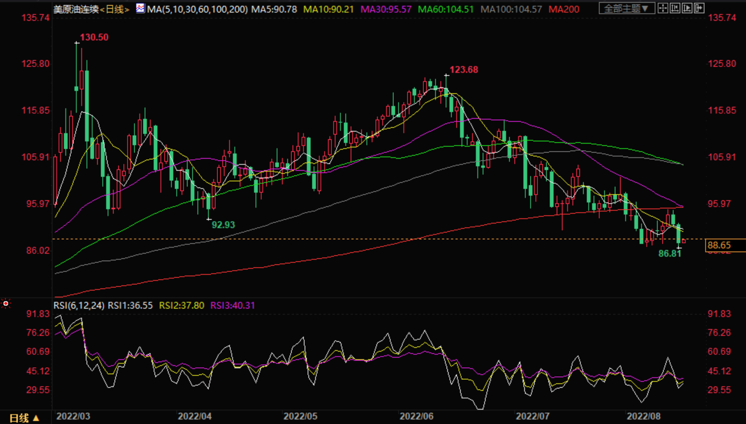 周二亚盘,美油现报88.39美元/桶;油价周一下跌超4%,一度创逾半年新低至86.81美元/桶,受累于全球经济衰退担忧,将导致燃料需求减少,加之伊朗正式回应欧盟提出的核协议文本,伊核协议或将达成,伊朗原油重回市场预期影响。