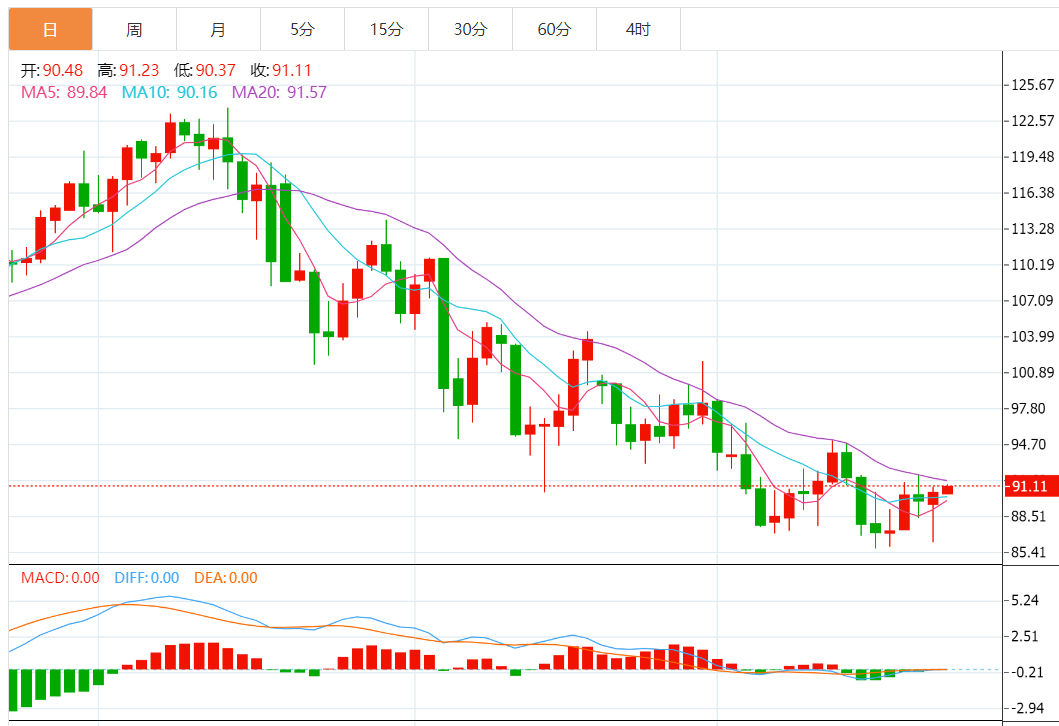 技术上,相对强弱指标(14)走出更低的高点及更高的高位有望构筑牛背离。因此,WTI油价目标是7月下旬以来的下行倾向阻力92.30美元附近。