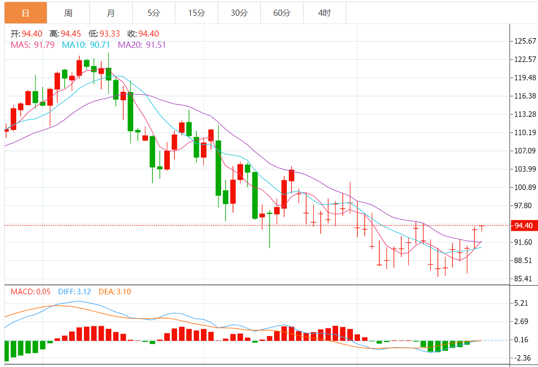 技术上,油价在上周触及85.71后震荡反弹,MACD金叉发散,KDJ金叉发散,5日均线上穿10日均线结成金叉,短线有望筑底成功,关注200日均线95.69附近阻力,若能顶破该阻力,则增加后市看涨信号,中线甚至会向上试探100日均线103.83附近阻力。