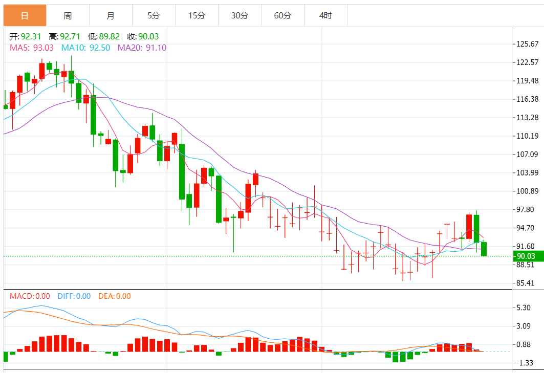 技术日图显示,油价受到55日均线阻力后不仅重新回落至200日均线下方,更是连续失守5日均线和10日均线,KDJ更是重新结成死叉,油价短线下行风险显著增加,初步支撑在21日均线91.18附近,然后是90关口附近支撑,如果失守该支撑,则油价可能会重新试探8月份低点85.71附近支撑,布林线下轨支撑也在该位置附近。
