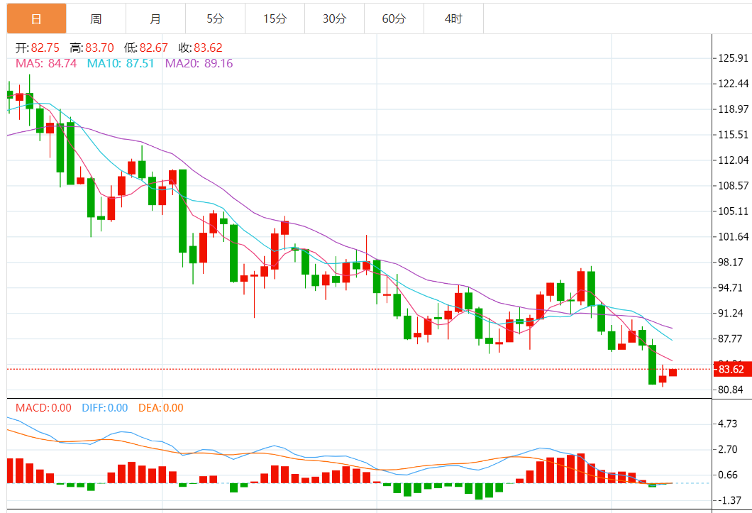 技术上,WTI油价反弹将测试2021 年12 月至2022 年1 月上行趋势的的61.8%斐波位,即强阻力86.85 美元附近。即使WTI油价突破86.85 美元关口,90.00 美元关口和50日均线所处水平93.30 美元也将成为WTI油价上行目标,对WTI油价多头占主导构成考验。