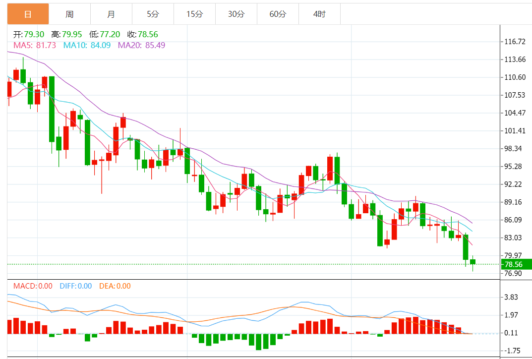 技术上,油价失守80关口,短线存在进一步下跌风险,关注1月3日创下的年内低点74.27附近支撑,进一步支撑在12月9日高点73.34附近,73.34-74.27区域支撑较强,短线跌破该区域支撑的可能性不大。12月29日低点75.36附近支撑也可以简单予以留意。