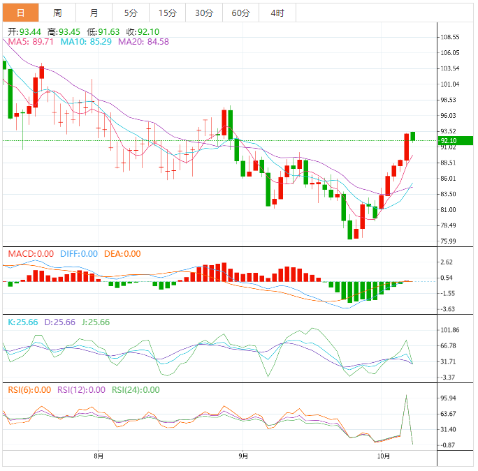 技术上,目前也在颈线和55日均线附近受阻,短线油价存在一定的调整需求,初步支撑在5日均线86.92附近,9月21日高点86.65附近支撑也在该位置附近,强支撑在21日均线84.22附近,前期下跌通道的上轨支撑也在该位置附近;重点关注“左肩”9月8日低点81.17附近支撑,如果失守该支撑,则削弱“头肩底”的可能性。