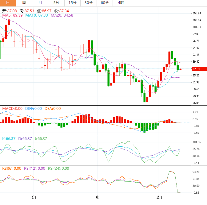 技术上,后市仍有机会重拾反弹走势,短线继续留意9月5日高点90.36附近阻力(5日均线阻力相去不远),若能顶破该阻力,则增加短线看涨信号;布林线上轨阻力在93.16附近,123.68-76.23跌势的38.2%回撤位阻力在94.37附近,若能顶破该阻力,则增加中线看涨信号。不过,KDJ仍有死叉趋势,5日均线仍压制油价,若油价下破55日均线88.21附近支撑,则增加短线看空信号;进一步支撑在10日均线87.01附近,21日均线支撑在84.81附近。