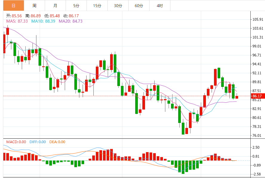 技术日图限时,MACD红色柱萎缩,KDJ死叉,5日均线下穿10日均线结成死叉,油价回落至55日均线下方,后市下行风险有所增加,留意21日均线84.77附近支撑,若失守该位置,则油价可能会进一步跌向布林线下轨77.08附近;短线的话,9月29日高点82.92、80整数关口和9月30日低点79.12附近也还分别存在一定的支撑。