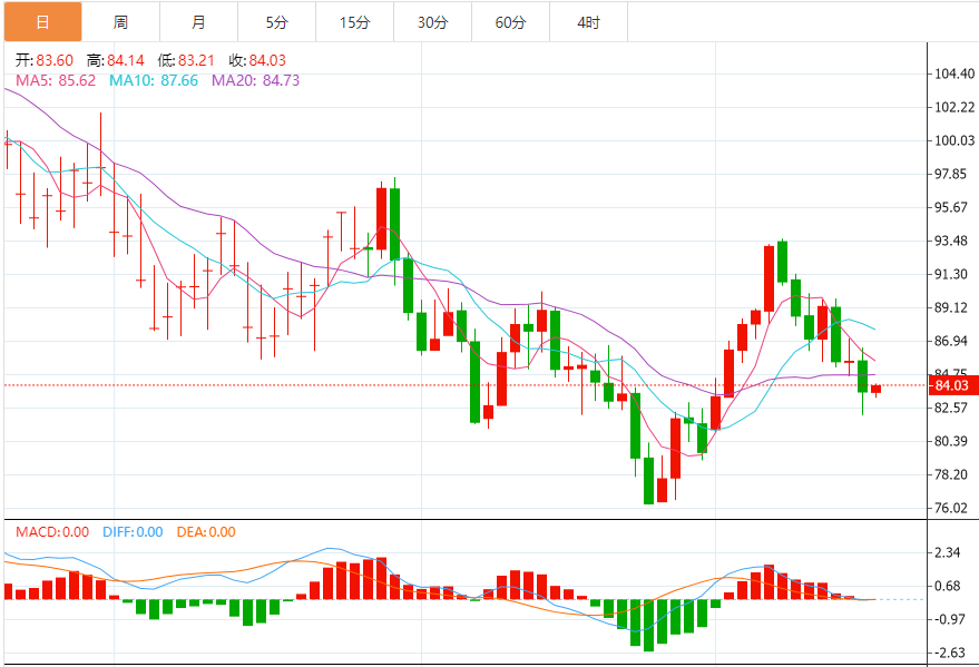 技术上,油价跌破20日移动均线,扩大跌幅,因卖家关注80美元/桶,这很可能发生,因为相对强度指数(RSI)跌至50下方,在达到超卖状况之前有足够的空间。