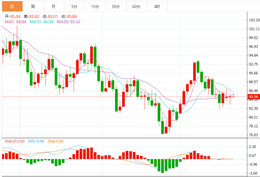 与此同时,21日均线和前期阻力分别在84.55美元和81.90美元附近,将构成WTI油价短线支撑。如果空头仍占主导,WTI油价跌破81.90美元,就不排除油价跌向9月低位76.15美元的可能。