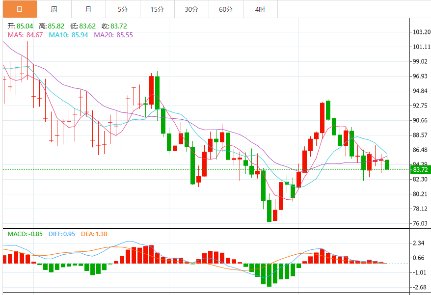技术上,短线略微偏向下行,如果跌破布林线下轨82.85支撑,76.23-93.61涨势的61.8%回撤位支撑也在该位置附近,则增加后市看空信号;进一步支撑在82.06附近,然后是80整数关口,9月30日低点支撑在79.12附近。