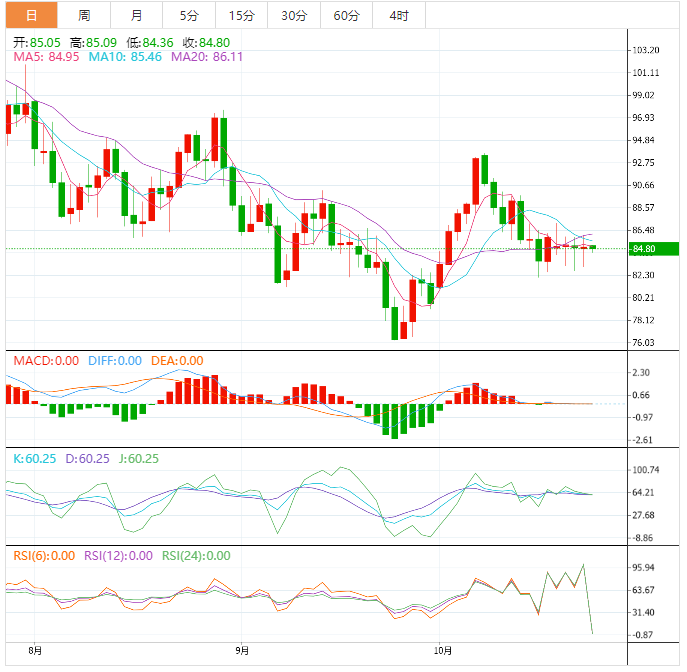 技术上,短线略微偏向震荡下行,继续关注9月29日高点82.92附近支撑,若下破该支撑,则油价可能会进一步试探布林线下轨76.95附近支撑,短线的话,80整数关口和9月30日低点79.12附近也还分别存在一些支撑。上方初步阻力在10日均线85.68附近,10月20日高点阻力在87.12附近(略高于55日均线),若油价能够顶破该阻力,则增加短线看涨信号。