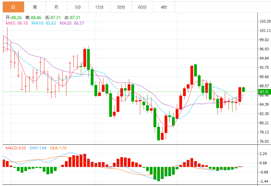 技术上,短线偏向多头,初步阻力在日内高点88.46附近,10月12日高点阻力在90.05附近,布林线上轨阻力目前在93.03附近,未来几个交易日油价有望涨向该位置附近。强阻力在100日均线93.71附近,10月10日高点阻力也在该位置附近。