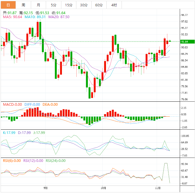 美油交投于91.65美元/桶附近;油价周一收跌,在触及逾两个月最高后回吐涨幅,疫情限制放缓提振油价;中国10月原油进口量反弹至5月以来最高水平。美元兑欧元周一下跌,英镑受到冒险情绪出现和欧股反弹的支撑,这给油价带去支撑。尽管世界各地的炼厂都在增产,但欧盟对俄罗斯海运原油出口的禁令将于12月5日开始实施,预计供应将会收紧,这也支撑油价。本季,美国炼厂产能利用率达到接近或超过90%的水平。