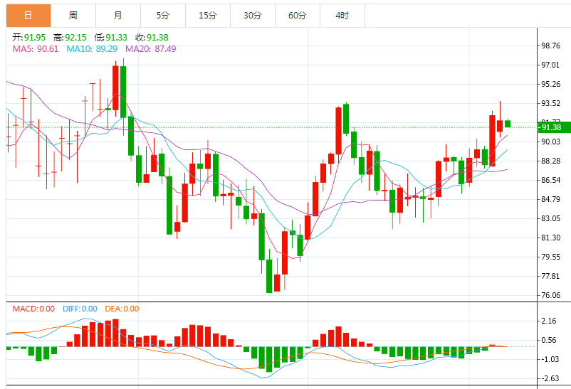 技术上,短期均线向上发散,若能顶破10月10日高点93.61附近阻力,则增加短中线看涨信号;8月25日高点阻力在95.72附近,进一步阻力在8月30日高点97.64附近,200日均线阻力在98.39附近。