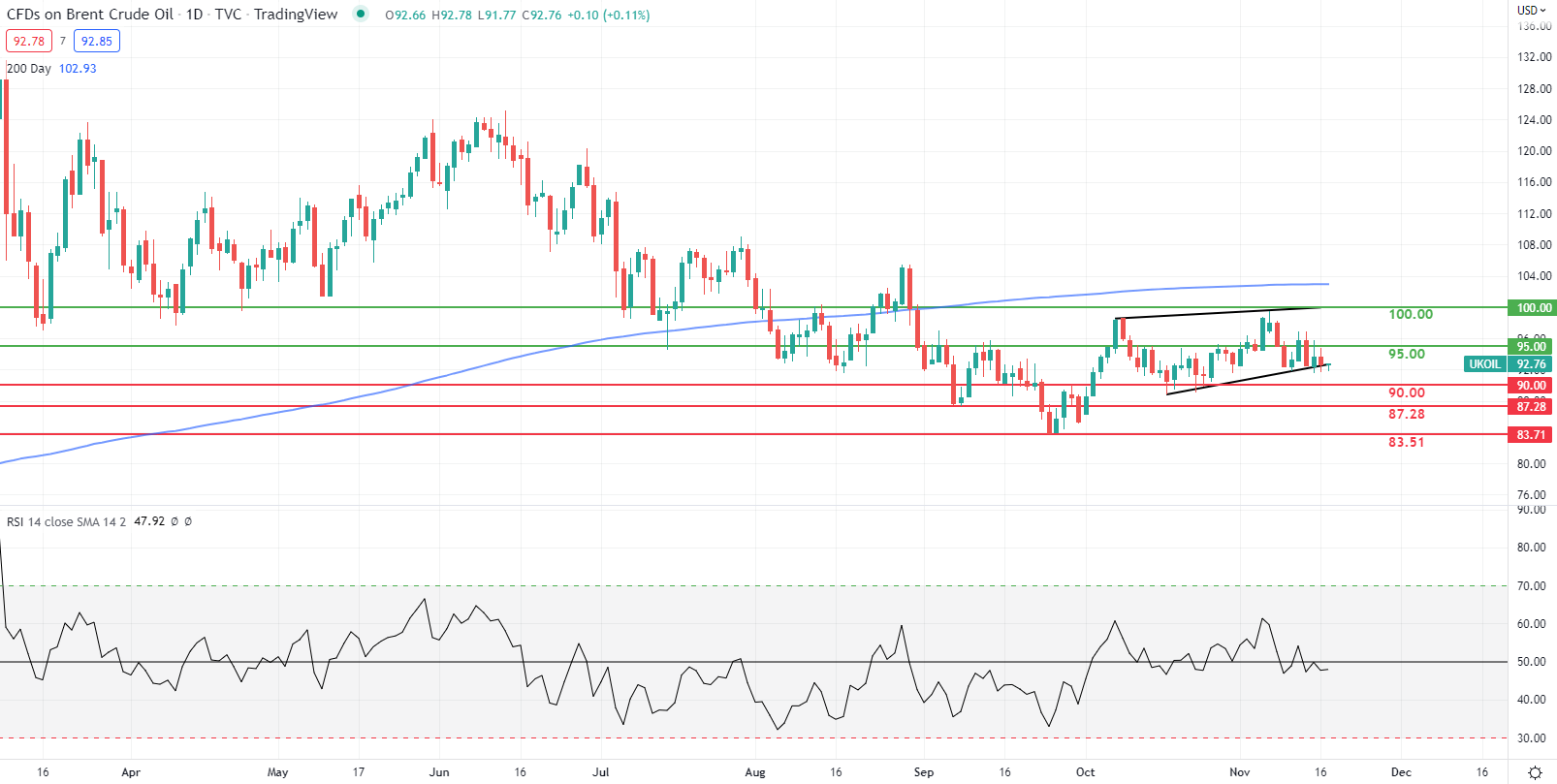 布伦特原油价格走势正在测试下限上升的楔形图形成(黑色)。日线蜡烛收于该支撑区域下方可能会引发进一步下行至心理水平90.00。话虽如此,RSI仍保持在50的中点附近,目前既不利于看涨也不看跌势头,反映了基本面环境。这导致预计短期内价格波动最小,并应将布伦特原油保持在90-95范围内。