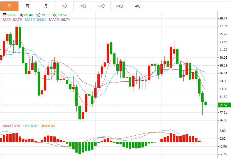 技术上,油价跌破10月18日低点82.06附近支撑后延续跌势,布林线开口,油价短线明显偏向空头,后市偏向沿布林线下轨向下运行,重点关注9月份触及的1月4日以来低点79.23附近支撑;如果失守该支撑,则增加中线看空信号。进一步支撑参考1月3日低点74.27附近,12月27日低点支撑在72.57附近,然后是70整数关口。